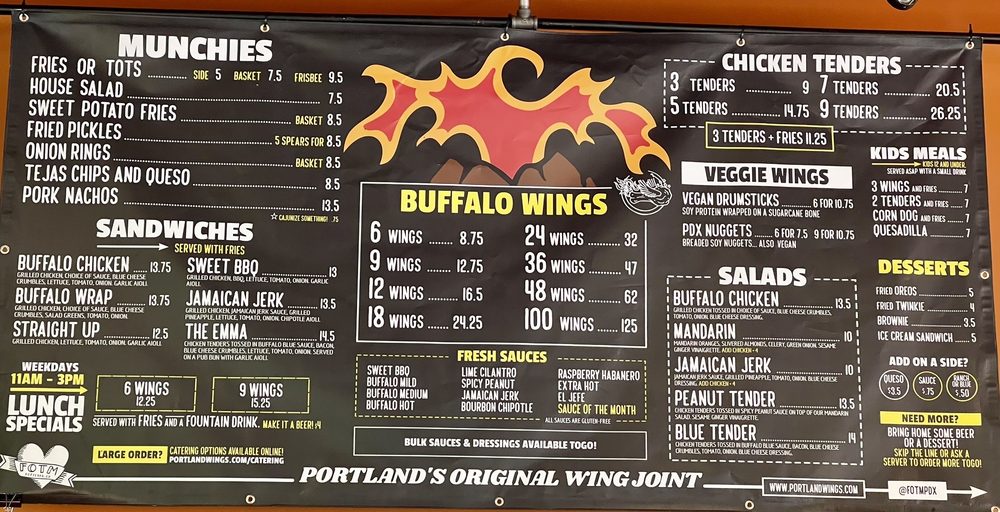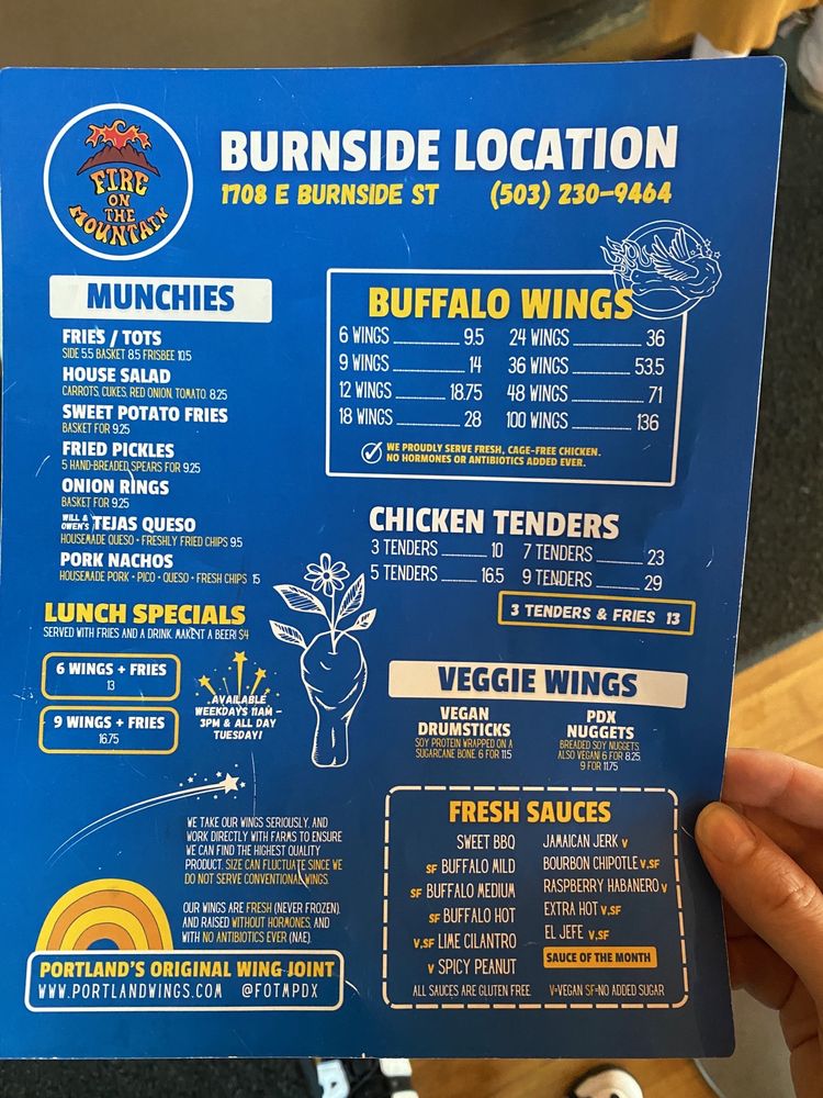 **Fire On the Mountain** is a popular spot in Portland, specializing in chicken wings and a laid-back beer bar atmosphere. Offering a variety of options, from vegan dishes to traditional bar food like onion rings and loaded nachos, this place caters to a diverse crowd. The standout dishes include the wings, served with a range of flavorful sauces, and the fresh-cut fries or tater tots for a satisfying side. Customers rave about the friendly service, generous portions, and the diverse selection of sauces. The outdoor seating and chill vibe make it a great spot to hang out with friends. With a commitment to sustainability, they also provide compostable containers and plastic-free packaging. If you're a wing enthusiast looking for a relaxed dining experience, **Fire On the Mountain** is a must-visit.